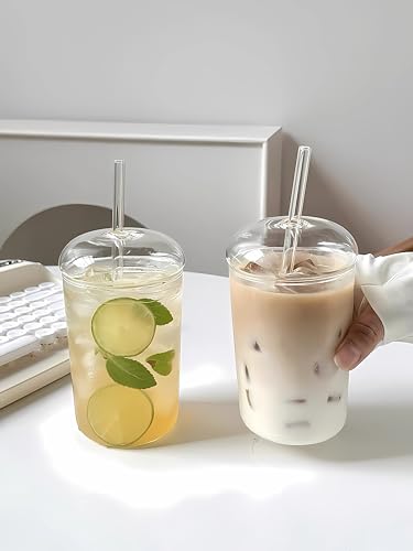 2 Pcs Drinking Glasses with Glass Lids and Glass Straw 16oz Glassware Set,Iced Coffee Glasses,Ideal for Water,Soda,Tea,Gift – with Cleaning Brushe