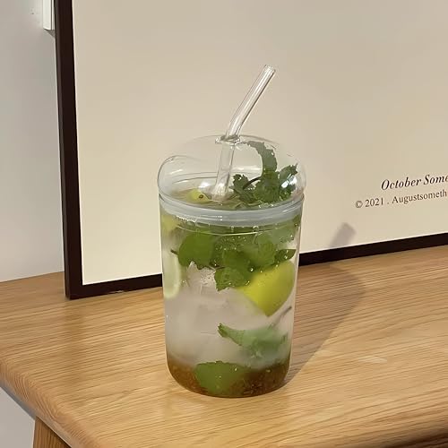 2 Drinking Glasses Set: 16oz Drinking glasses set includes 2 glass cups [ Diameter 3 in, Height 4.8 in],2 reusable glass lids,2 reusable glass straws and 1 cleaning brush, unique design.