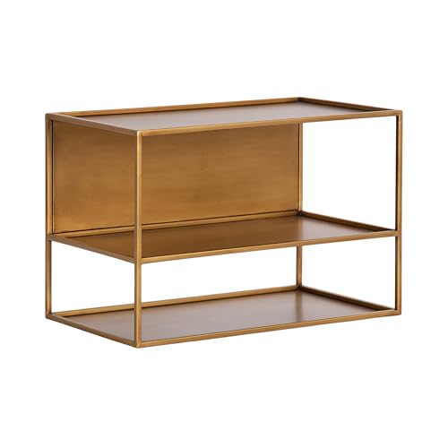 Add a storage accent to your home that saves floor space with the bold and modern Nomi side table! The Nomi floating shelf has a painted gold finish with slight antiquing that can fit into various decor aesthetics while having a flexible and functional design. The body was made entirely from solid metal, giving it a distinct look and superior quality. The Nomi shelf has a large display surface and features a variety of storage spots, allowing you to utilize it for multiple functions in your home. This floating shelf’s overall dimensions are 18 inches wide by 10 inches deep by 12 inches tall for larger household necessities like a tablet, phone, or keys. This Nomi isn’t just fantastic for household storage and display, but you can also use it as a floating nightstand next to your bed. Pair two or more of these floating shelves to create a spanning media or entryway console. Hang this shelf easily with its attached keyhole hangers as it arrives to you fully assembled.