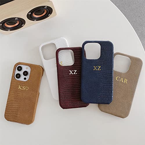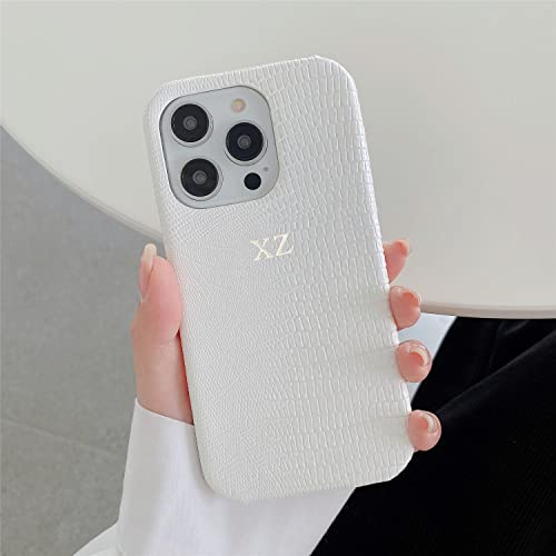 Personalise Gold Silver Initial Letters Leather Case for iPhone 14 Promax 13 Pro Xs Max 12 11 XR 7 8 Plus Luxury Lizard Skin Texture PU Cover (White)