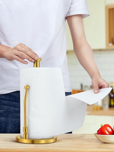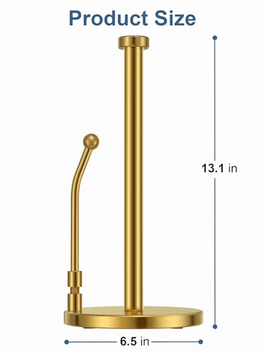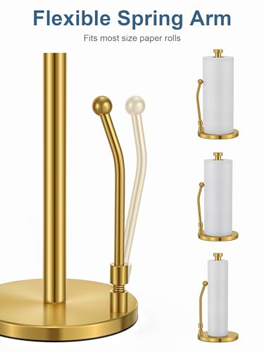 SMARTAKE Paper Towel Holder, Paper Towel Dispenser Standing Weighted Base Non Slip, Spring Arm Fit Most Size Paper Roll, Stainless Steel Kitchen Roll Stand for Home Kitchen Countertop Tabletop, Gold