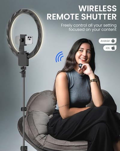 Phone/Tablet Holder & Wireless Remote: The included phone holder extends from 2.2 inches to 3.9 inches, while the tablet holder extends from 3.9 to 7.4 inches, making it compatible with nearly all smartphones and tablets. The upgraded version extra large 12-inch ring light, provides ample space for you to freely adjust the position and angle of the phone holder, allowing for both horizontal and vertical shooting. he wireless remote allows for easy selfies or group photos from up to 30 feet away, supporting both iOS and Android operating systems without the need to download an app
