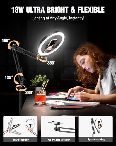 Revolutionary Design & Unmatched Stability: This ring light features a cutting-edge design that combines the best features of traditional ring light with stand and overhead ring light. Its heavy-duty, non-slip metal base ensures stability even at extreme angles. Unlike clamp lights, you don’t need to worry about desk edge thickness and shape. Compared to tripods, it saves space and offers more flexibility. The included wireless remote allows easy adjustments for full control over shot angles
