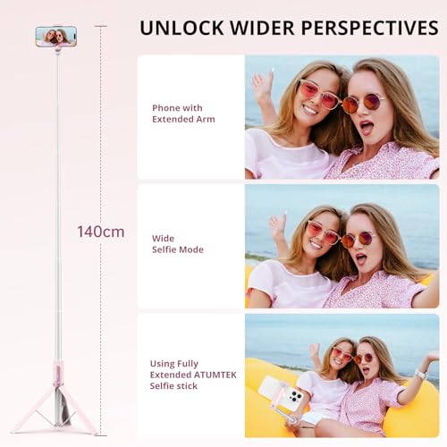 ATUMTEK 55″ Selfie Stick Tripod, All-in-one Extendable Aluminum Phone Tripod with Rechargeable Bluetooth Remote for iPhone, Samsung, Google, LG, Sony and More, Fitting 4.7-7 inch Smartphones, Pink