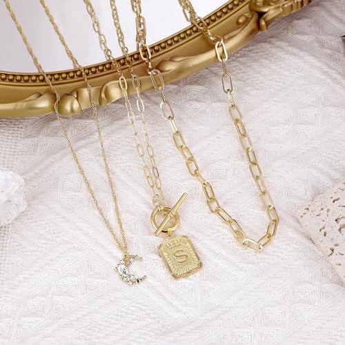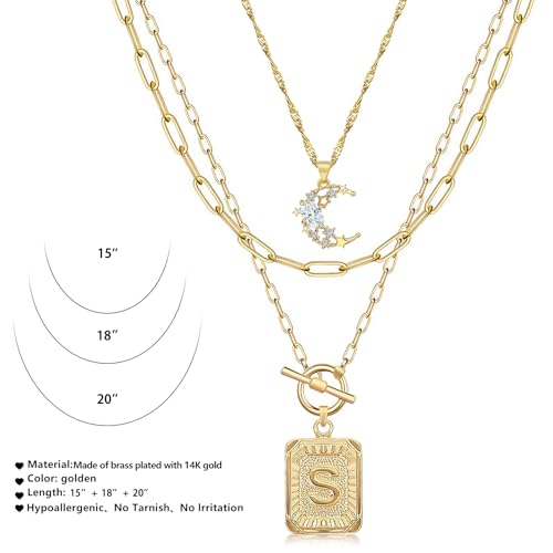 MJartoria Layered Initial Necklaces for Women Trendy, 14K Gold Plated Simple Moon Choker Square Letter Pendant Necklace, Paperclip Chain Necklace, Gold Necklaces Jewelry Gifts