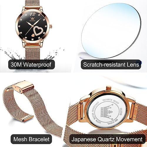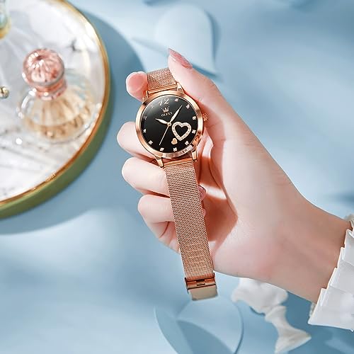 OLEVS Women’s Small Wrist Rose Gold Tone Watch – Cute Diamond Heart Arabic Numerals Dial, Fashion Waterproof Mesh Bracelet Analog Dress for Ladies