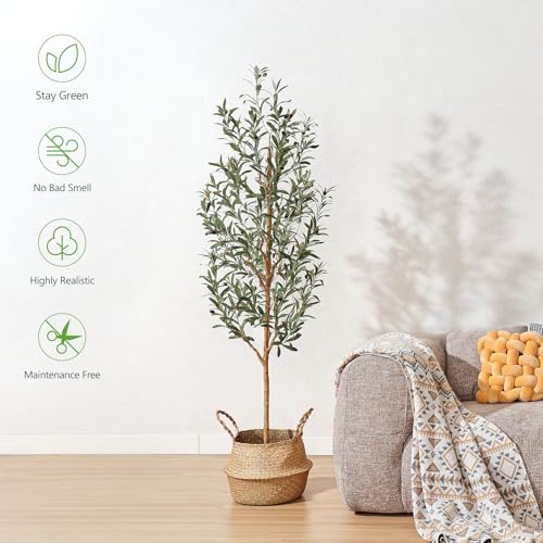 Faux Olive Tree 6FT – Tall Artificial Plants Indoor with Real Wood Trunk & Seagrass Basket, Lifelike Silk Leaves & Fruits – Potted Large Fake Trees for Home, Living Room, Bedroom & Office Decor