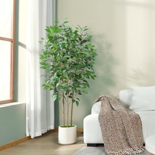Ficus Artificial Tree 5ft Tall Fake Ficus Tree for Home Decor Indoor Faux Silk Ficus Plant Fake Floor Plant in White Imitation Ceramic Planter with Green Fake Moss, Set of 1