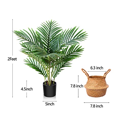SIZE- The fake palm plants are about 2 feet from the bottom of the black pot to the top of the tree, and the black plastic pot with 4.5 inch(H) x 5 inch(W). If you have any question about this 2 FT palm tree, please feel free to contact us