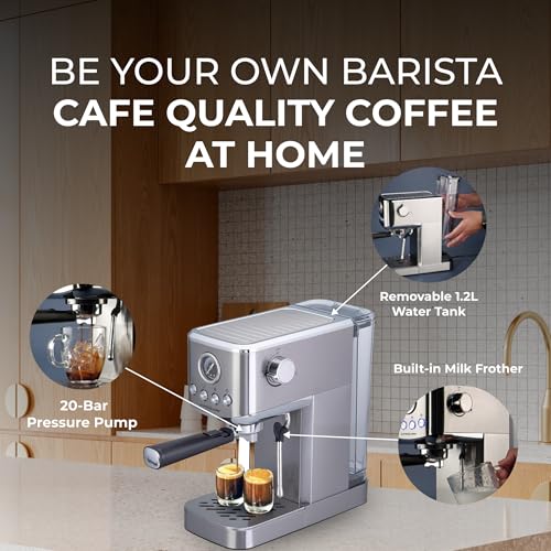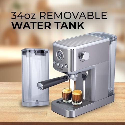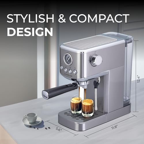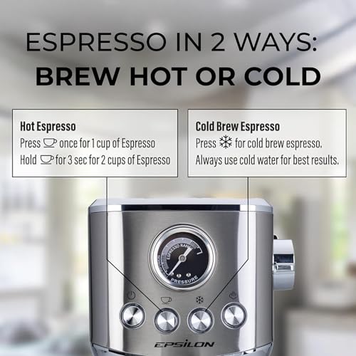 Epsilon Coffee Machine with Milk Frother, Compact 20-Bar Espresso Maker, Hot and Iced Coffee Maker with Removable Water Tank, Cold Brew Feature, and Steam Wand, 1.2L Capacity – Stainless Steel