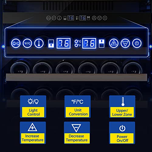 【𝐏𝐫𝐨𝐟𝐞𝐬𝐬𝐢𝐨𝐧𝐚𝐥 𝐃𝐮𝐚𝐥 𝐙𝐨𝐧𝐞 𝐖𝐢𝐧𝐞 𝐂𝐨𝐨𝐥𝐞𝐫】With a unique dual-zone design, you can store various wine collections, It can accommodate larger bottles, such as Champagne. The upper zone ranges from 40℉ to 55℉ while the lower zone is between 55 ℉ to 65 ℉. This wine cooler with two temperature zones will satisfy both red and white wine lovers.