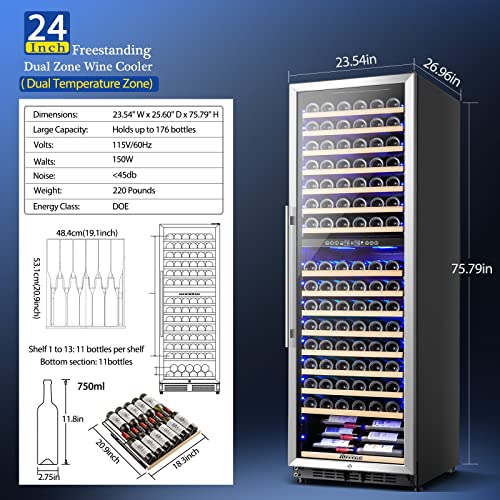 AAOBOSI Wine Cooler Dual Zone 24 Inch, 176 Bottles Wine Refrigerator, Freestanding Wine Fridge with Intelligent Temperature Memory & Humidity Control Compressor Cooling, Quiet Operation