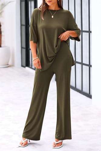 KIRUNDO Womens 2 Piece Outfits 2025 Summer Casual Loose Short Sleeve Pullover Tops & Wide Leg Pants Lounge Sets Tracksuit