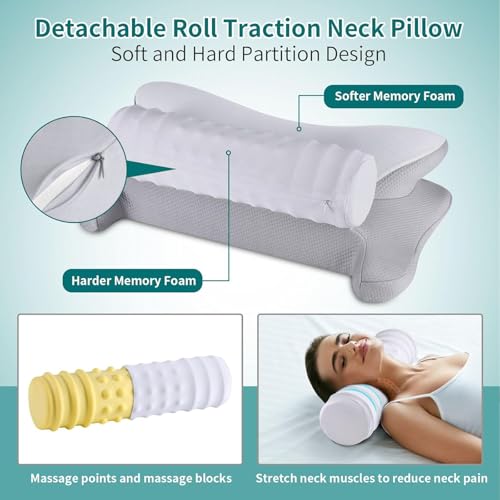 onesmile Cervical and Roll Neck Pillow-2 in 1 Removable Ergonomic for Pain Relief, Support for Sleeping, Memory Foam for Side, Back & Stomach Sleepers (Grey)
