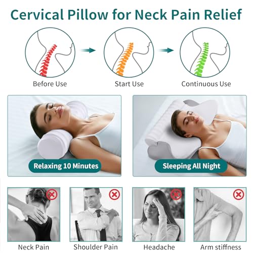 Safe Memory Foam Pillow: The pillow measures 23 x 15.5 x 5.5 inches(length x width x height); the roll pillow section is 16.9 x 4.7 inches(length x height)The neck pillow is made of slow rebound memory foam that is safe and non-toxic, long-term use is not easy to collapse. The cervical pillow is ergonomically designed with different heights and shapes to suit the natural curvature of the spine, providing targeted support for your head and neck and promoting spinal alignment. The ergonomic pillow enables you to fall into a deep sleep rapidly and comfortably and you will no longer be troubled by neck pain upon waking up