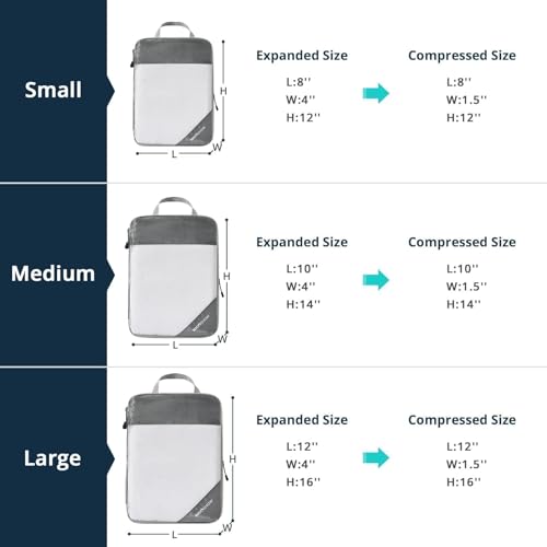 Versatile Usage: These compression packing cubes are ideal for all your travel needs, whether for vacation, hiking, or camping. It could fit ideally in 20-inch carry-ons and 22-inch luggage, as well as backpacks, duffel bags, and totes