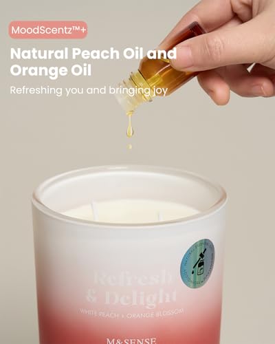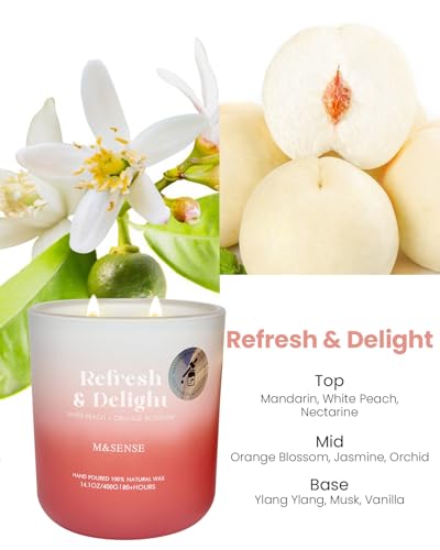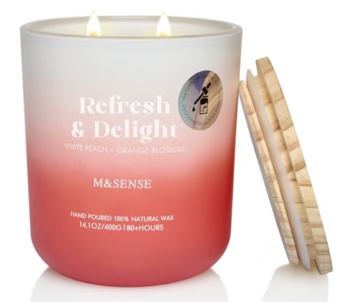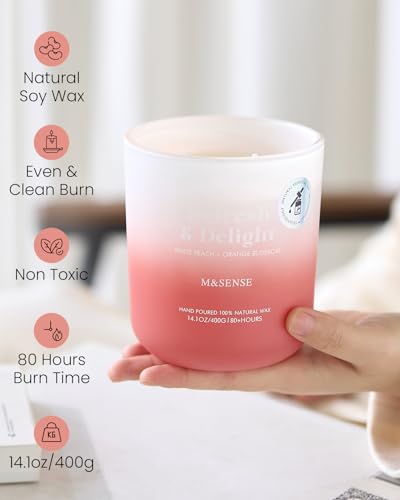 M&SENSE White Peach & Orange Blossom Scented Candle for Home, 14.1oz 80-Hour Non Toxic Long-Lasting Natural Soy Wax Scent Fragrance, 2 Wick Aromatherapy Candle for Women Men Family Friends