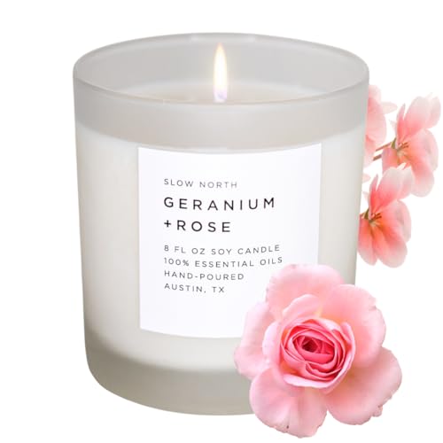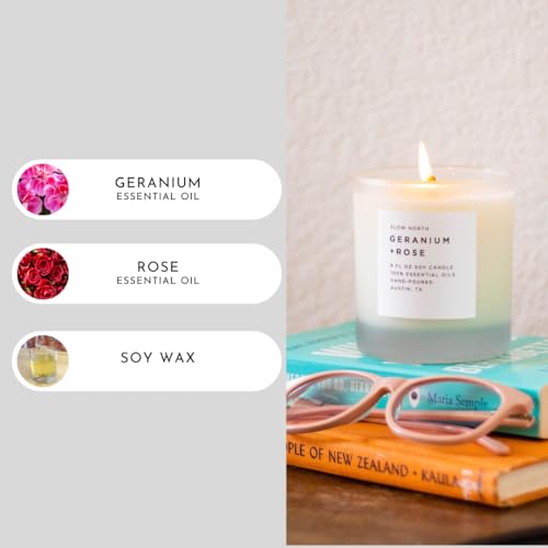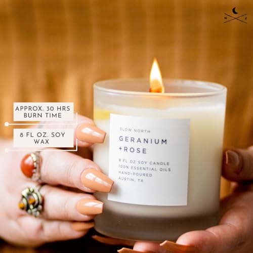 Slow North Geranium + Rose Candle – Essential Oils and Pure Soy Wax Candle in a Reusable Frosted Glass Jar – A Unique Scented Candle Hand-Poured in The USA (8 oz)