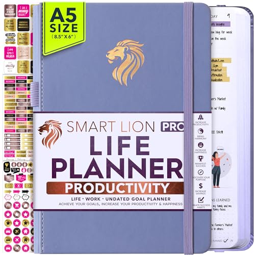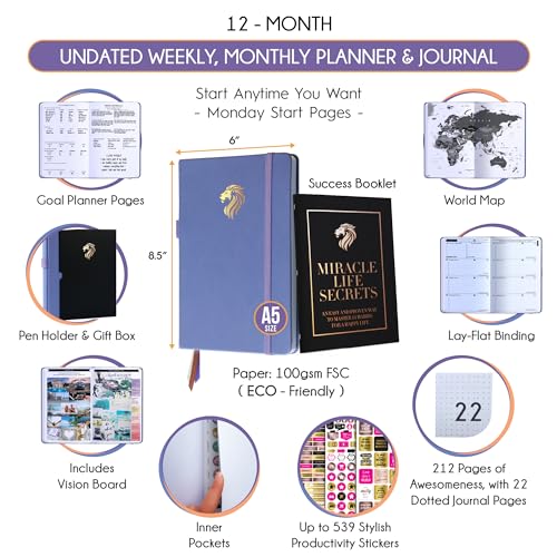 UNDATED PLANNER – All the tools for success you need to create the life you’ve always wanted. This planner measures A5 (6 x 8.5 inches) and boasts thick 100 gsm paper. It features a Horizontal Planner layout, offering 212 pages for life transformation, including 53 weekly spreads, 12 monthly planning overviews with reflection sections, 22 dotted journal pages, habit trackers, mind maps, morning and evening routines, inner pockets, pen holder, and comes in a gift box. This life planner is undated, serving as a daily, weekly, and monthly planner, giving you the freedom to start your journey whenever it suits you best.